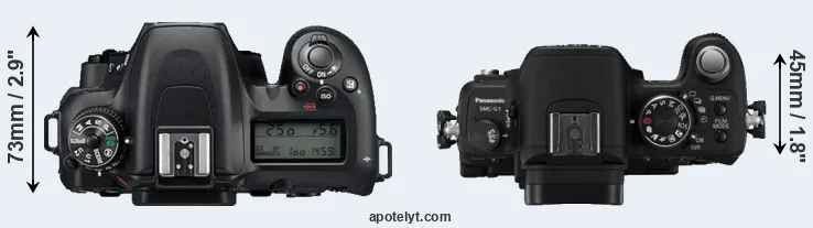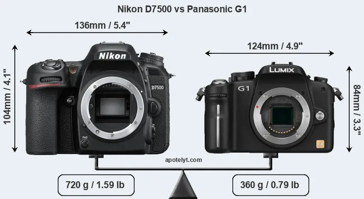 The physical size and weight of the Nikon D7500 and the Panasonic G1 are illustrated in the side-by-side display below. The two cameras are presented according to their relative size. Three consecutive views from the front, the top, and the rear side are shown. All width, height and depth measures are rounded to the nearest millimeter.