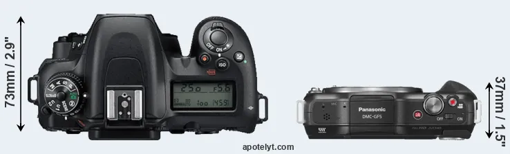 The physical size and weight of the Nikon D7500 and the Panasonic GF5 are illustrated in the side-by-side display below. The two cameras are presented according to their relative size. Three consecutive views from the front, the top, and the rear side are shown. All width, height and depth measures are rounded to the nearest millimeter.