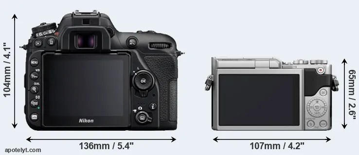 The side-by-side display below illustrates the physical size and weight of the Nikon D7500 and the Panasonic GX850. The two cameras are presented according to their relative size. Three consecutive perspectives from the front, the top, and the back are available. All width, height and depth measures are rounded to the nearest millimeter.