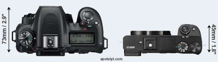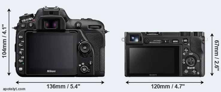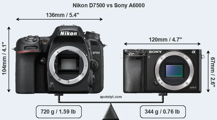 The physical size and weight of the Nikon D7500 and the Sony A6000 are illustrated in the side-by-side display below. The two cameras are presented according to their relative size. Three successive views from the front, the top, and the rear are shown. All width, height and depth measures are rounded to the nearest millimeter.