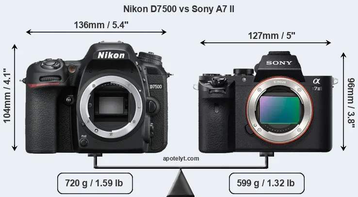 The physical size and weight of the Nikon D7500 and the Sony A7 II are illustrated in the side-by-side display below. The two cameras are presented according to their relative size. Three consecutive perspectives from the front, the top, and the back are available. All size dimensions are rounded to the nearest millimeter.