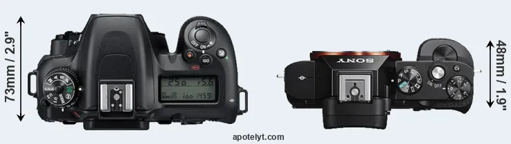 An illustration of the physical size and weight of the Nikon D7500 and the Sony A7S is provided in the side-by-side display below. The two cameras are presented according to their relative size. Three successive views from the front, the top, and the rear are shown. All width, height and depth dimensions are rounded to the nearest millimeter.