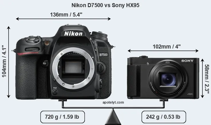 An illustration of the physical size and weight of the Nikon D7500 and the Sony HX95 is provided in the side-by-side display below. The two cameras are presented according to their relative size. Three consecutive perspectives from the front, the top, and the back are available. All size dimensions are rounded to the nearest millimeter.