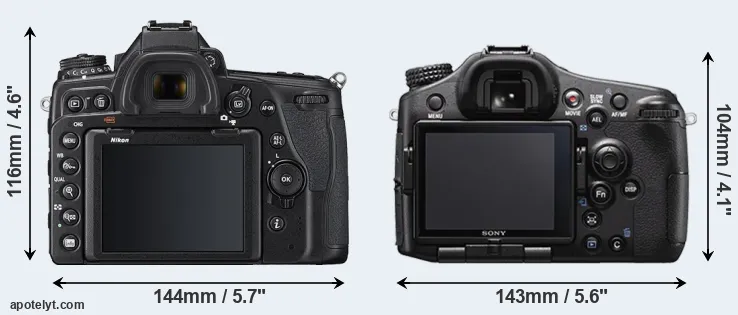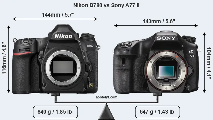 The side-by-side display below illustrates the physical size and weight of the Nikon D780 and the Sony A77 II. The two cameras are presented according to their relative size. Three consecutive perspectives from the front, the top, and the back are available. All width, height and depth dimensions are rounded to the nearest millimeter.