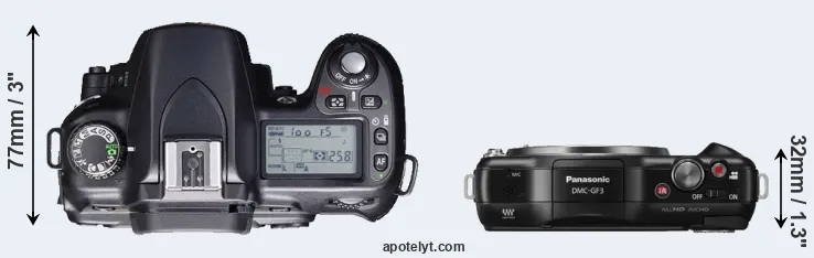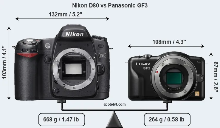 An illustration of the physical size and weight of the Nikon D80 and the Panasonic GF3 is provided in the side-by-side display below. The two cameras are presented according to their relative size. Three successive views from the front, the top, and the rear are shown. All width, height and depth dimensions are rounded to the nearest millimeter.