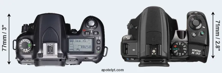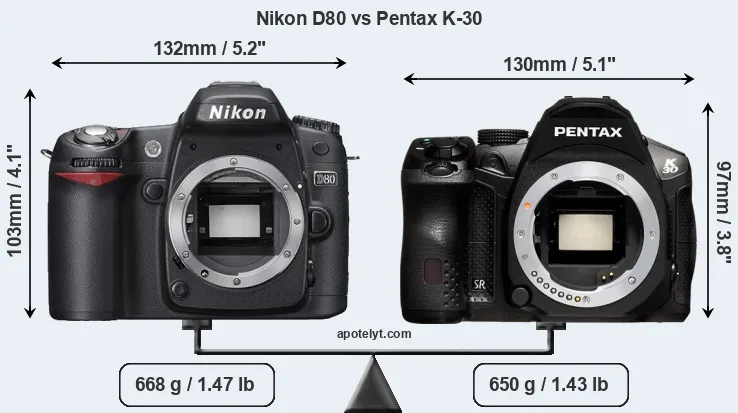 An illustration of the physical size and weight of the Nikon D80 and the Pentax K-30 is provided in the side-by-side display below. The two cameras are presented according to their relative size. Three successive views from the front, the top, and the rear are shown. All size dimensions are rounded to the nearest millimeter.