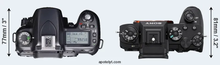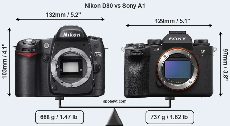 The physical size and weight of the Nikon D80 and the Sony A1 are illustrated in the side-by-side display below. The two cameras are presented according to their relative size. Three consecutive perspectives from the front, the top, and the back are available. All width, height and depth dimensions are rounded to the nearest millimeter.