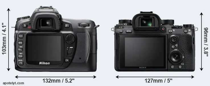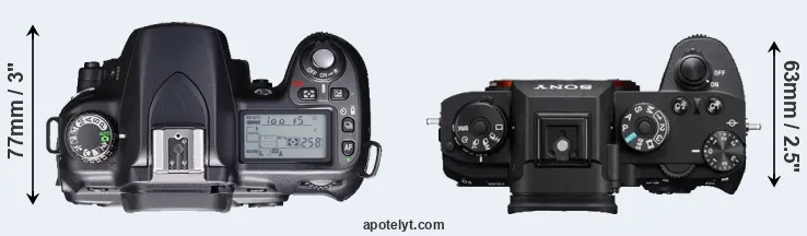 The side-by-side display below illustrates the physical size and weight of the Nikon D80 and the Sony A9. The two cameras are presented according to their relative size. Three successive views from the front, the top, and the rear are shown. All size dimensions are rounded to the nearest millimeter.
