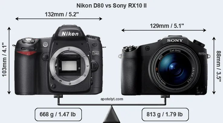 Going beyond this snapshot of core features and characteristics, what are the differences between the Nikon D80 and the Sony Cyber-shot DSC-RX10 II? Which one should you buy? Read on to find out how these two cameras compare with respect to their body size, their imaging sensors, their shooting features, their input-output connections, and their reception by expert reviewers.