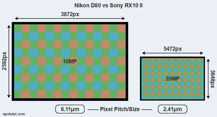 Despite having a smaller sensor, the RX10 II offers a higher resolution of 20 megapixels, compared with 10 MP of the D80. This megapixels advantage comes at the cost of a higher pixel density and a smaller size of the individual pixel (with a pixel pitch of 2.41μm versus 6.11μm for the D80). However, it should be noted that the RX10 II is much more recent (by 8 years and 10 months) than the D80, and its sensor will have benefitted from technological advances during this time that make it possible to gather light more efficiently.