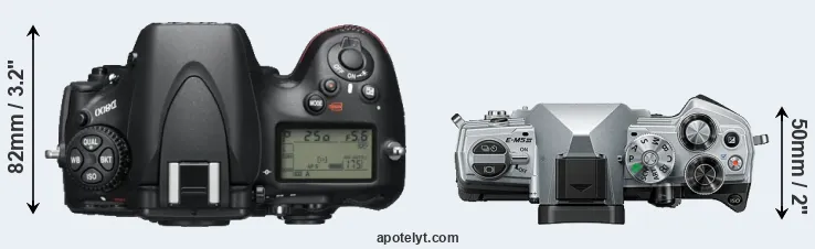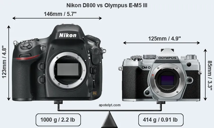 The physical size and weight of the Nikon D800 and the Olympus E-M5 III are illustrated in the side-by-side display below. The two cameras are presented according to their relative size. Three consecutive views from the front, the top, and the rear side are shown. All size dimensions are rounded to the nearest millimeter.