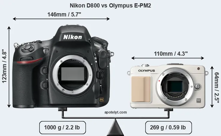 If the front view area (width x height) of the cameras is taken as an aggregate measure of their size, the Olympus E-PM2 is considerably smaller (61 percent) than the Nikon D800. Moreover, the E-PM2 is substantially lighter (73 percent) than the D800. It is worth mentioning in this context that the D800 is splash and dust resistant, while the E-PM2 does not feature any corresponding weather-sealing.