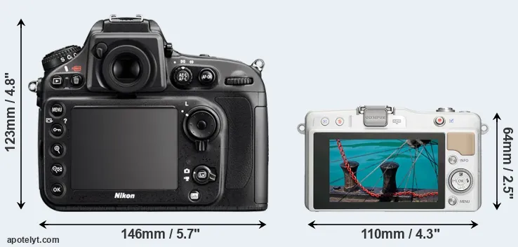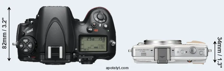 The physical size and weight of the Nikon D800 and the Olympus E-PM2 are illustrated in the side-by-side display below. The two cameras are presented according to their relative size. Three consecutive views from the front, the top, and the rear side are shown. All width, height and depth dimensions are rounded to the nearest millimeter.