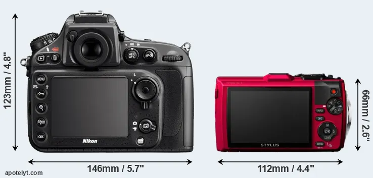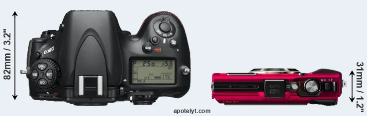 An illustration of the physical size and weight of the Nikon D800 and the Olympus TG-4 is provided in the side-by-side display below. The two cameras are presented according to their relative size. Three successive views from the front, the top, and the rear are shown. All width, height and depth measures are rounded to the nearest millimeter.