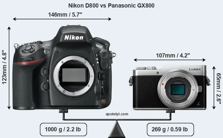 An illustration of the physical size and weight of the Nikon D800 and the Panasonic GX800 is provided in the side-by-side display below. The two cameras are presented according to their relative size. Three consecutive perspectives from the front, the top, and the back are available. All width, height and depth measures are rounded to the nearest millimeter.