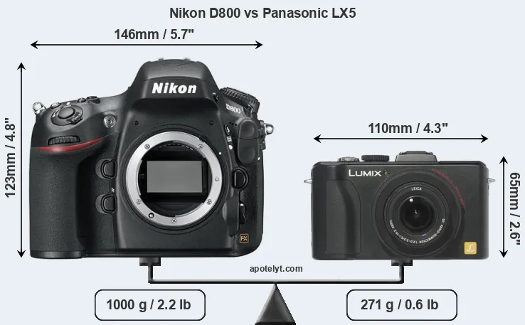 The above size and weight comparisons are to some extent incomplete and possibly misleading, as the LX5 has a lens built in, whereas the D800 is an interchangeable lens camera that requires a separate lens. Attaching the latter will add extra weight and bulk to the setup. You can compare the optics available for the D800 and their specifications in the Nikon Lens Catalog.