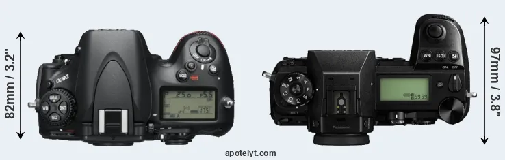 An illustration of the physical size and weight of the Nikon D800 and the Panasonic S1 is provided in the side-by-side display below. The two cameras are presented according to their relative size. Three consecutive views from the front, the top, and the rear side are shown. All width, height and depth measures are rounded to the nearest millimeter.