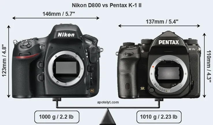An illustration of the physical size and weight of the Nikon D800 and the Pentax K-1 II is provided in the side-by-side display below. The two cameras are presented according to their relative size. Three successive views from the front, the top, and the rear are shown. All size dimensions are rounded to the nearest millimeter.