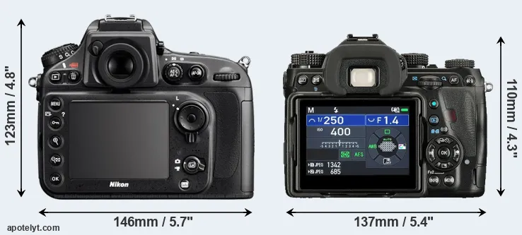 Going beyond this snapshot of core features and characteristics, what are the differences between the Nikon D800 and the Pentax K-1 II? Which one should you buy? Read on to find out how these two cameras compare with respect to their body size, their imaging sensors, their shooting features, their input-output connections, and their reception by expert reviewers.