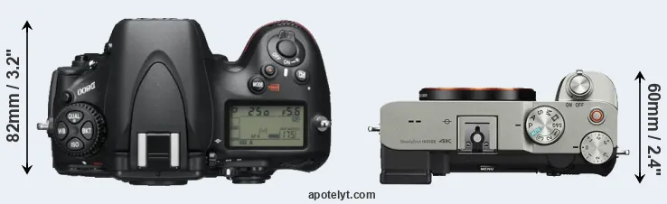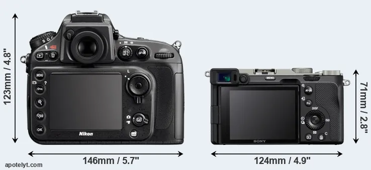 The physical size and weight of the Nikon D800 and the Sony A7C are illustrated in the side-by-side display below. The two cameras are presented according to their relative size. Three successive views from the front, the top, and the rear are shown. All size dimensions are rounded to the nearest millimeter.