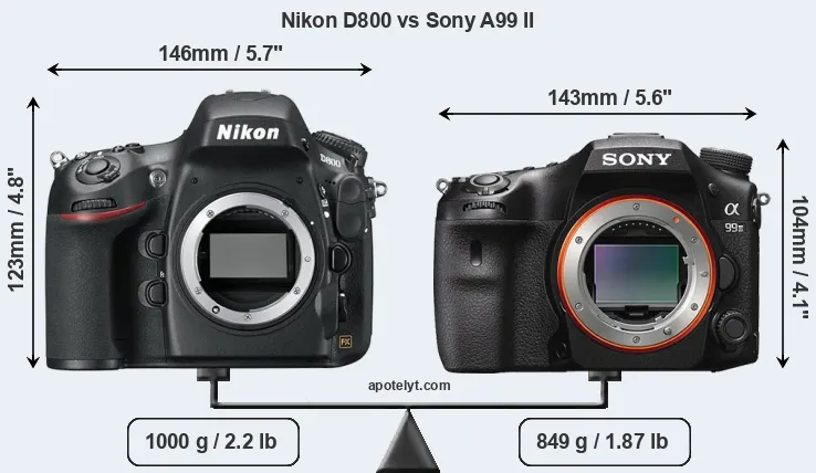 The physical size and weight of the Nikon D800 and the Sony A99 II are illustrated in the side-by-side display below. The two cameras are presented according to their relative size. Three consecutive views from the front, the top, and the rear side are shown. All width, height and depth measures are rounded to the nearest millimeter.