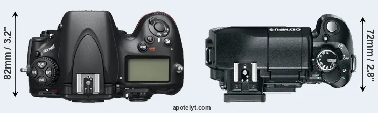 An illustration of the physical size and weight of the Nikon D800E and the Olympus E-330 is provided in the side-by-side display below. The two cameras are presented according to their relative size. Three consecutive perspectives from the front, the top, and the back are available. All size dimensions are rounded to the nearest millimeter.