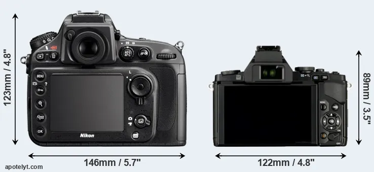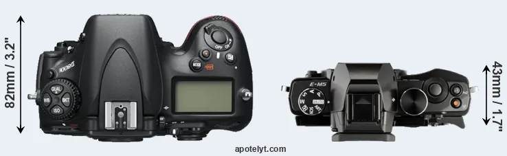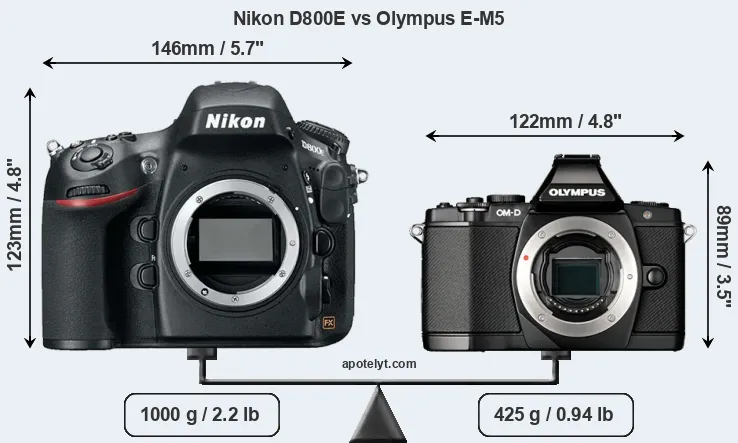 The side-by-side display below illustrates the physical size and weight of the Nikon D800E and the Olympus E-M5. The two cameras are presented according to their relative size. Three consecutive perspectives from the front, the top, and the back are available. All width, height and depth dimensions are rounded to the nearest millimeter.