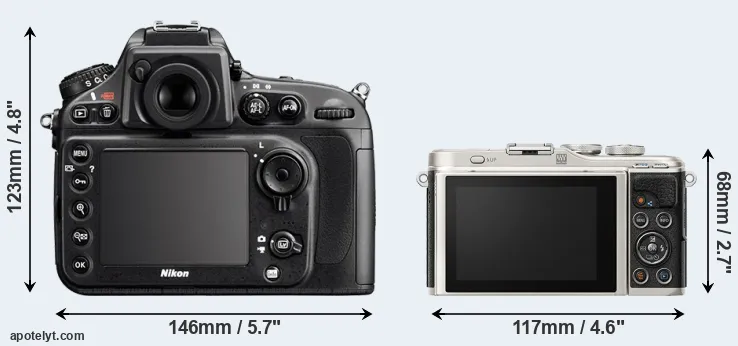 The side-by-side display below illustrates the physical size and weight of the Nikon D800E and the Olympus E-PL9. The two cameras are presented according to their relative size. Three consecutive perspectives from the front, the top, and the back are available. All size dimensions are rounded to the nearest millimeter.