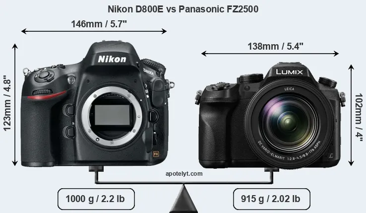 An illustration of the physical size and weight of the Nikon D800E and the Panasonic FZ2500 is provided in the side-by-side display below. The two cameras are presented according to their relative size. Three successive views from the front, the top, and the rear are shown. All width, height and depth dimensions are rounded to the nearest millimeter.