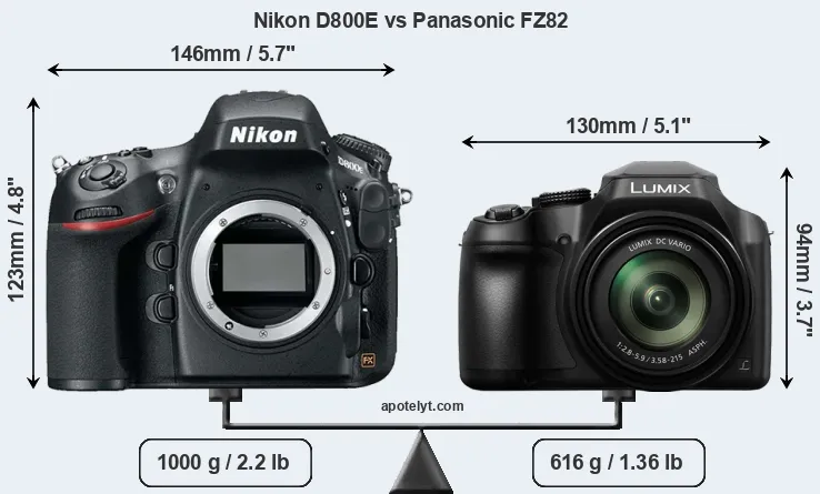 The above size and weight comparisons are to some extent incomplete and possibly misleading, as the FZ82 has a lens built in, whereas the D800E is an interchangeable lens camera that requires a separate lens. Attaching the latter will add extra weight and bulk to the setup. You can compare the optics available for the D800E and their specifications in the Nikon Lens Catalog.