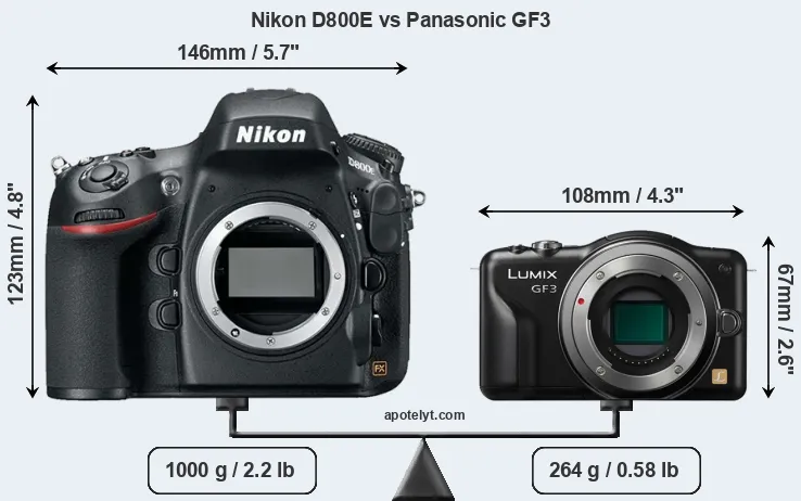 The physical size and weight of the Nikon D800E and the Panasonic GF3 are illustrated in the side-by-side display below. The two cameras are presented according to their relative size. Three consecutive perspectives from the front, the top, and the back are available. All size dimensions are rounded to the nearest millimeter.