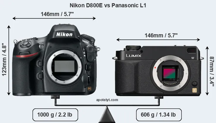 If the front view area (width x height) of the cameras is taken as an aggregate measure of their size, the Panasonic L1 is notably smaller (29 percent) than the Nikon D800E. Moreover, the L1 is substantially lighter (39 percent) than the D800E. It is worth mentioning in this context that the D800E is splash and dust resistant, while the L1 does not feature any corresponding weather-sealing.