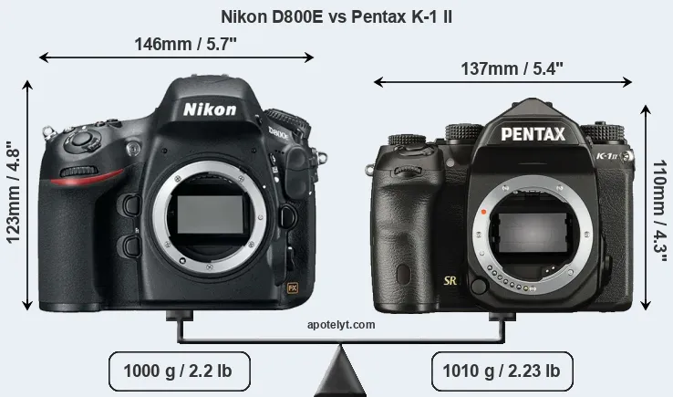 An illustration of the physical size and weight of the Nikon D800E and the Pentax K-1 II is provided in the side-by-side display below. The two cameras are presented according to their relative size. Three successive views from the front, the top, and the rear are shown. All size dimensions are rounded to the nearest millimeter.
