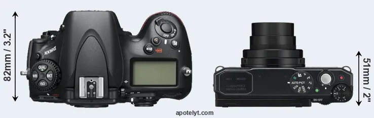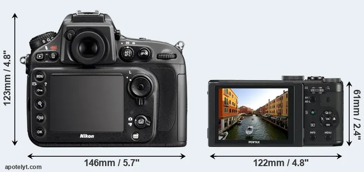 The side-by-side display below illustrates the physical size and weight of the Nikon D800E and the Pentax MX-1. The two cameras are presented according to their relative size. Three consecutive perspectives from the front, the top, and the back are available. All size dimensions are rounded to the nearest millimeter.