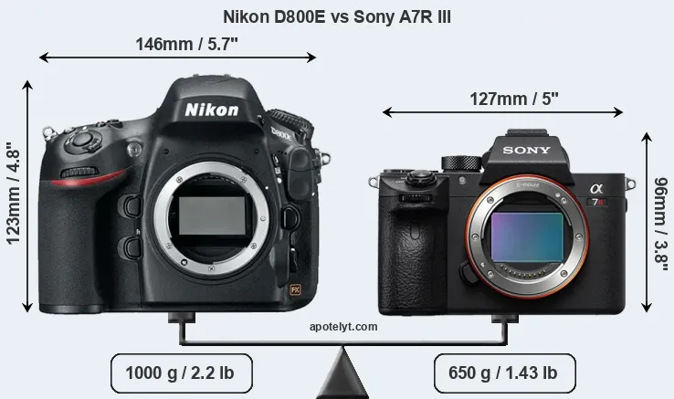 The above size and weight comparisons are to some extent incomplete since they do not consider the interchangeable lenses that both of these cameras require. Both cameras have similarly sized sensors, but DSLRs have a larger flange-to-focal plane distance than mirrorless cameras, which imposes contraints on the optical engineering process and generally leads to bigger and heavier lenses. You can compare the optics available for the two cameras in the Nikon Lens Catalog (D800E) and the Sony FE Lens Catalog (A7R III). Mirrorless cameras, such as the A7R III, have moreover the advantage that they can use many lenses from other systems via adapters, as they have a relatively short flange to focal plane distance.