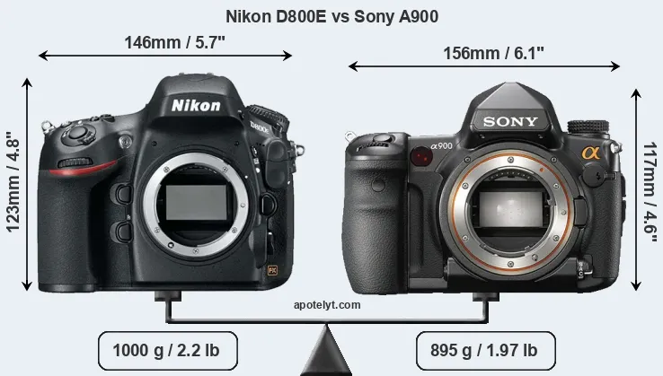 If the front view area (width x height) of the cameras is taken as an aggregate measure of their size, the Sony A900 is somewhat larger (2 percent) than the Nikon D800E. However, the A900 is markedly lighter (11 percent) than the D800E. In this context, it is worth noting that both cameras are splash and dust-proof and can, hence, be used in inclement weather conditions or harsh environments.
