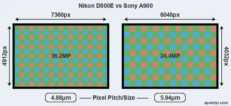 While the two cameras under review share the same sensor size, the D800E offers a higher resolution of 36.2 megapixels, compared with 24.4 MP of the A900. This megapixels advantage translates into a 22 percent gain in linear resolution. On the other hand, these sensor specs imply that the D800E has a higher pixel density and a smaller size of the individual pixel (with a pixel pitch of 4.88μm versus 5.94μm for the A900). In this context, it should be noted, however, that the D800E is much more recent (by 3 years and 4 months) than the A900, and its sensor will have benefitted from technological advances during this time that compensate for the smaller pixel size. Coming back to sensor resolution, it should be mentioned that the D800E has no anti-alias filter installed, so that it can capture all the detail its sensor resolves.