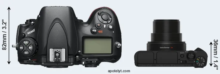 An illustration of the physical size and weight of the Nikon D800E and the Sony HX80 is provided in the side-by-side display below. The two cameras are presented according to their relative size. Three consecutive perspectives from the front, the top, and the back are available. All width, height and depth dimensions are rounded to the nearest millimeter.