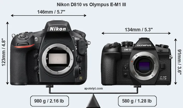 An illustration of the physical size and weight of the Nikon D810 and the Olympus E-M1 III is provided in the side-by-side display below. The two cameras are presented according to their relative size. Three successive views from the front, the top, and the rear are shown. All width, height and depth dimensions are rounded to the nearest millimeter.