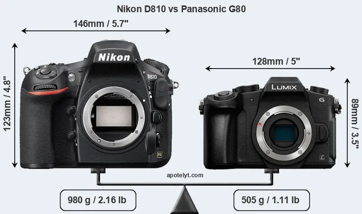 An illustration of the physical size and weight of the Nikon D810 and the Panasonic G80 is provided in the side-by-side display below. The two cameras are presented according to their relative size. Three successive views from the front, the top, and the rear are shown. All width, height and depth dimensions are rounded to the nearest millimeter.