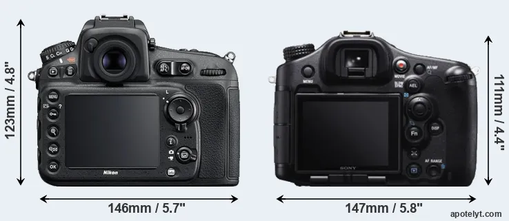 The side-by-side display below illustrates the physical size and weight of the Nikon D810 and the Sony A99. The two cameras are presented according to their relative size. Three consecutive perspectives from the front, the top, and the back are available. All width, height and depth measures are rounded to the nearest millimeter.