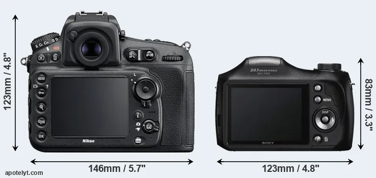 The side-by-side display below illustrates the physical size and weight of the Nikon D810 and the Sony H200. The two cameras are presented according to their relative size. Three successive views from the front, the top, and the rear are shown. All size dimensions are rounded to the nearest millimeter.
