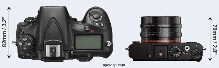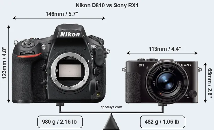 An illustration of the physical size and weight of the Nikon D810 and the Sony RX1 is provided in the side-by-side display below. The two cameras are presented according to their relative size. Three successive views from the front, the top, and the rear are shown. All width, height and depth dimensions are rounded to the nearest millimeter.