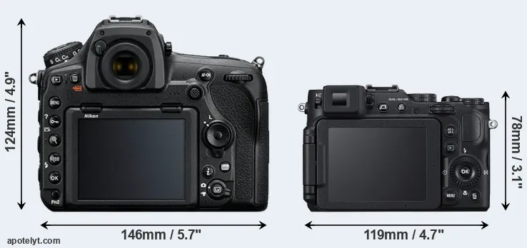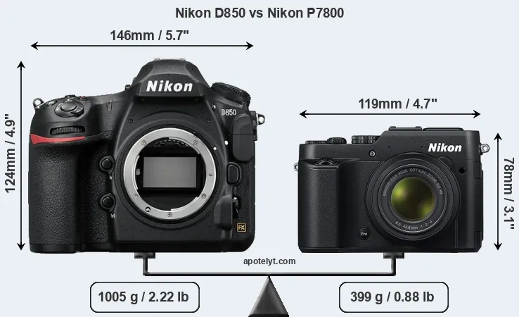 The side-by-side display below illustrates the physical size and weight of the Nikon D850 and the Nikon P7800. The two cameras are presented according to their relative size. Three consecutive perspectives from the front, the top, and the back are available. All width, height and depth measures are rounded to the nearest millimeter.