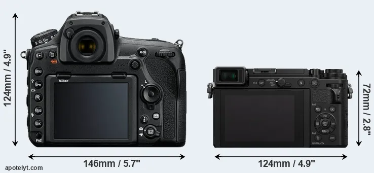 The physical size and weight of the Nikon D850 and the Panasonic GX9 are illustrated in the side-by-side display below. The two cameras are presented according to their relative size. Three consecutive perspectives from the front, the top, and the back are available. All width, height and depth dimensions are rounded to the nearest millimeter.
