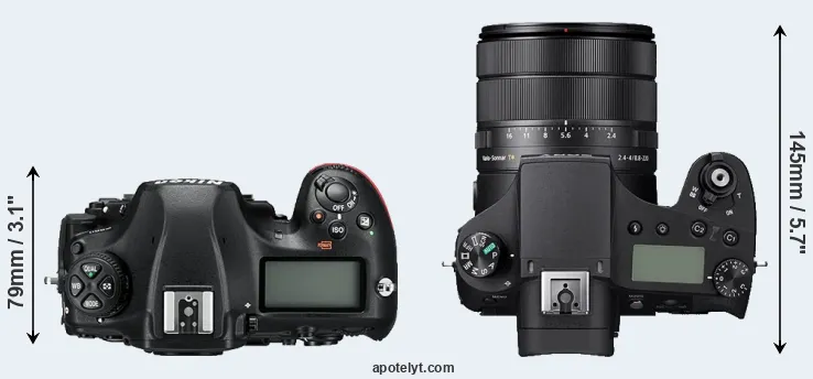 The physical size and weight of the Nikon D850 and the Sony RX10 IV are illustrated in the side-by-side display below. The two cameras are presented according to their relative size. Three consecutive perspectives from the front, the top, and the back are available. All width, height and depth dimensions are rounded to the nearest millimeter.