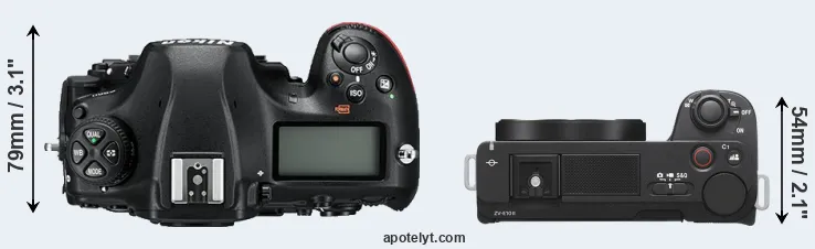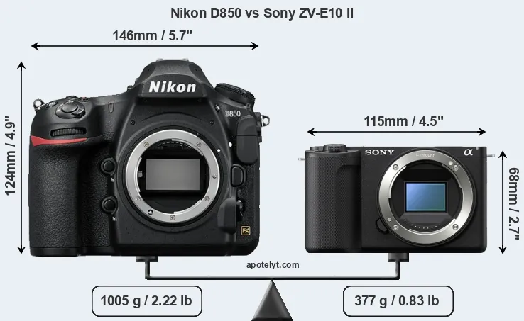 The side-by-side display below illustrates the physical size and weight of the Nikon D850 and the Sony ZV-E10 II. The two cameras are presented according to their relative size. Three successive views from the front, the top, and the rear are shown. All width, height and depth measures are rounded to the nearest millimeter.