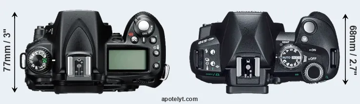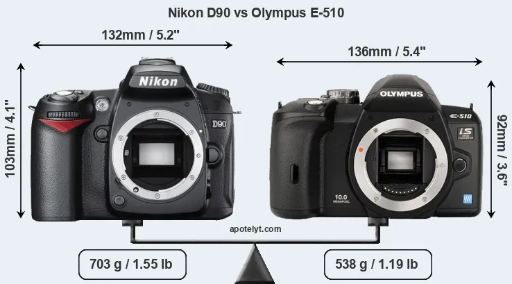 The side-by-side display below illustrates the physical size and weight of the Nikon D90 and the Olympus E-510. The two cameras are presented according to their relative size. Three consecutive perspectives from the front, the top, and the back are available. All width, height and depth measures are rounded to the nearest millimeter.