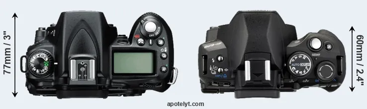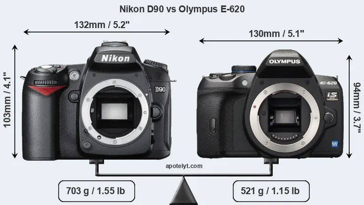 The side-by-side display below illustrates the physical size and weight of the Nikon D90 and the Olympus E-620. The two cameras are presented according to their relative size. Three successive views from the front, the top, and the rear are shown. All size dimensions are rounded to the nearest millimeter.