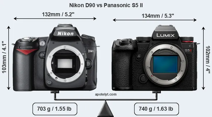 The physical size and weight of the Nikon D90 and the Panasonic S5 II are illustrated in the side-by-side display below. The two cameras are presented according to their relative size. Three consecutive views from the front, the top, and the rear side are shown. All width, height and depth measures are rounded to the nearest millimeter.